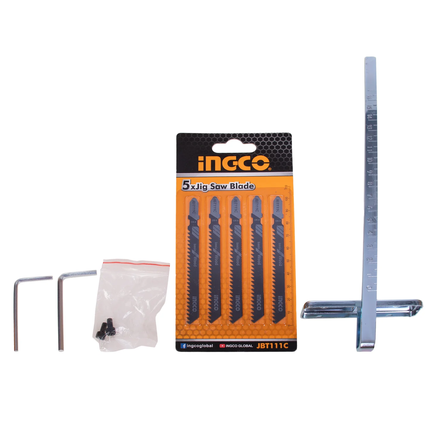 به همراه این اره یک بسته ۵ عددی تیغه چوب بر، دو عدد آچار آلن، یک عدد راهنمای مدرج، دفترچه راهنما و کارت گارانتی ارئه شده است. این بسته تیغ همراه، از نوع مدل JBT111C است که در درون آن ۵ عدد تیغه اره چوب بر با جنس بدنه فولاد کروم-وانادیوم و یک باطری ۲ آمپر به همراه یک شارژر قرار داده شده است.