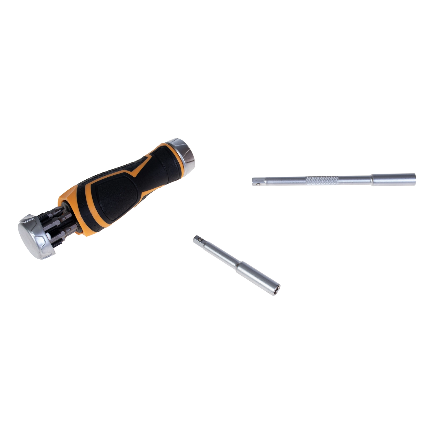 دسته جغجغه ۳۵ دندانهی این مجموعه که با پلاستیک آج دار ضد لغزش پوشانده شده است، به گونهای طراحی شده که قسمت انتهای آن باز شود و قابلیت نگهداری ۷ عدد سر بیت یا سر پیچ گوشتی را در داخل خود داشته باشد.