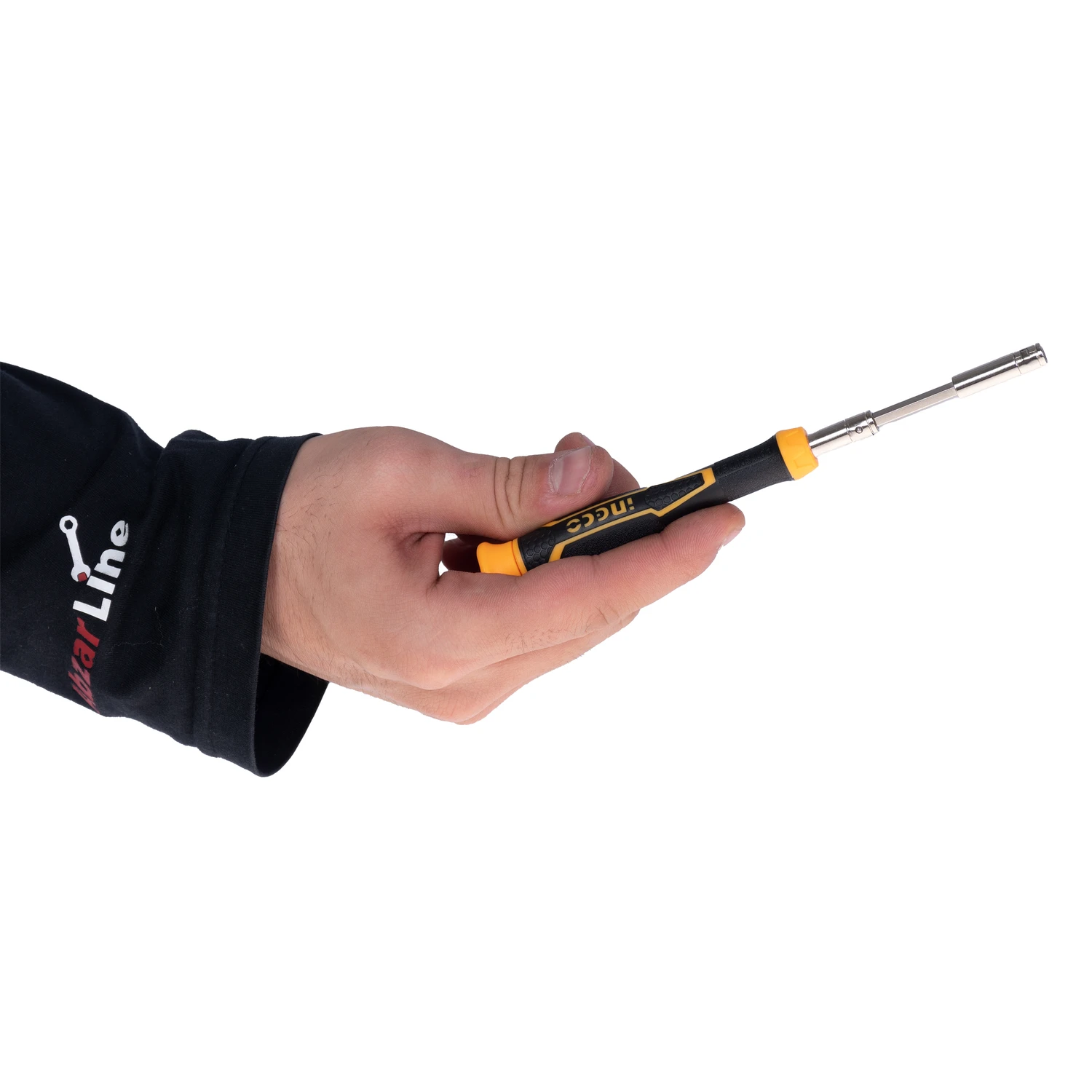 دارای یک دستهی 11 سانتیمتری با روکش پلاستیکی نرم ضد لغزش / دارای یک نگهدارندهی بیت 60 میلیمتری سایز 60×4 میلیمتر/ ثبت اختراع شده توسط شرکت اینکو |