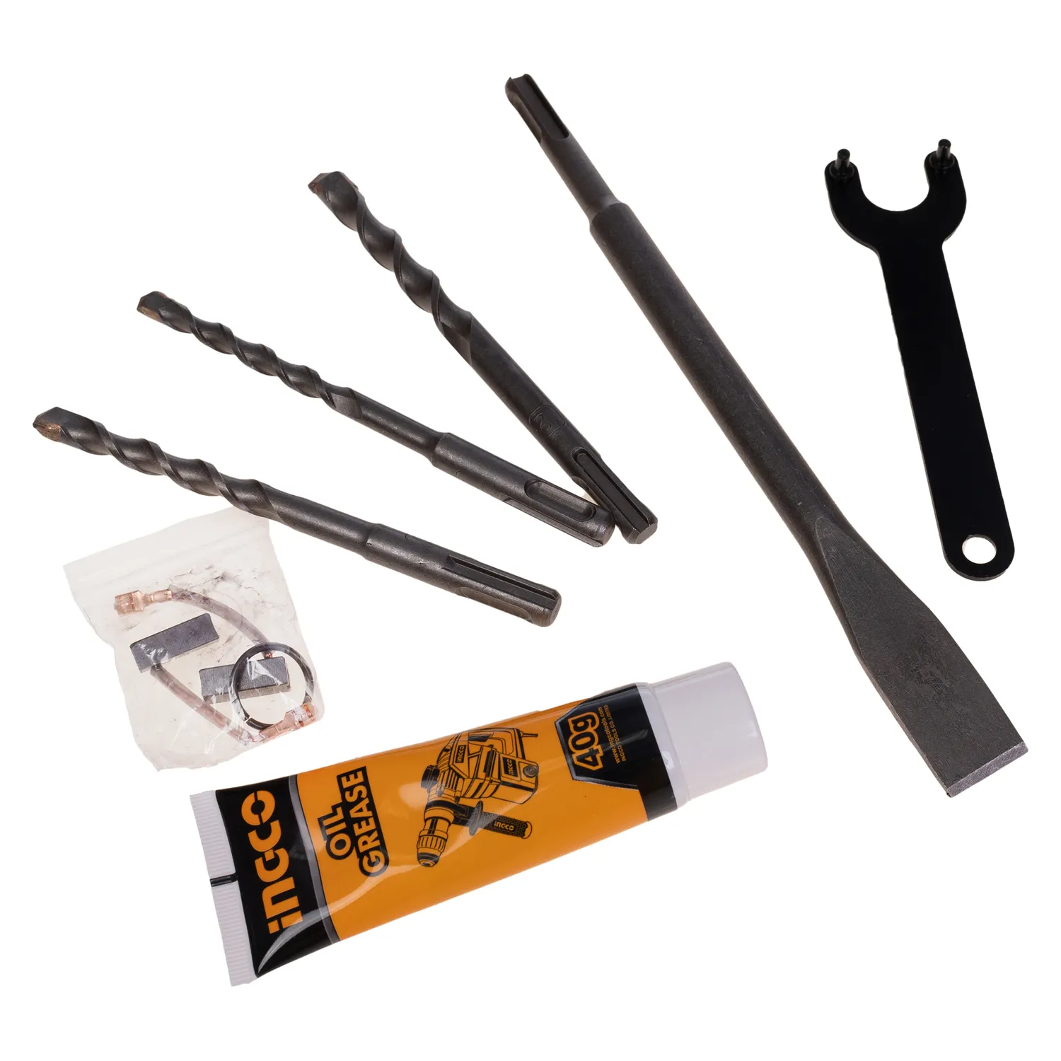 - همراه با سه عدد مته الماسه چهار شیار 8، 10 و 12 میلیمتر، یک عدد قلم نوک تیز، یک عدد قلم نوک پهن، دو عدد زغال اضافه، تیوپ گریس دفترچه راهنما و کارت گارانتی