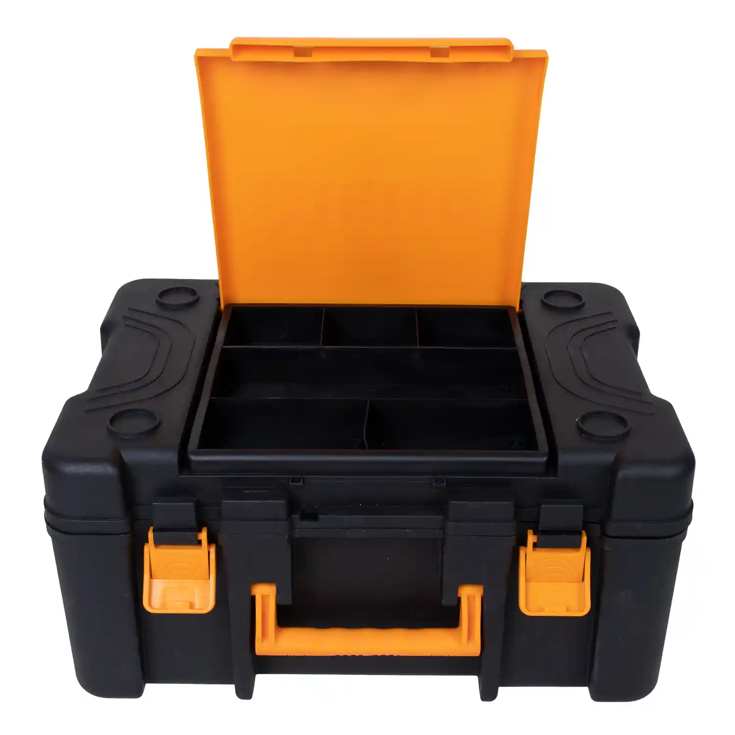 یکی از ویژگیهای کاربردی این جعبه ابزار، وجود ۶ محفظه نظمدهی در قسمت بالای آن است. این محفظهها برای نگهداری وسایلی مثل پیچ، رولپلاک، آچار فرز و ابزارهای کوچک بسیار مناسب هستند.