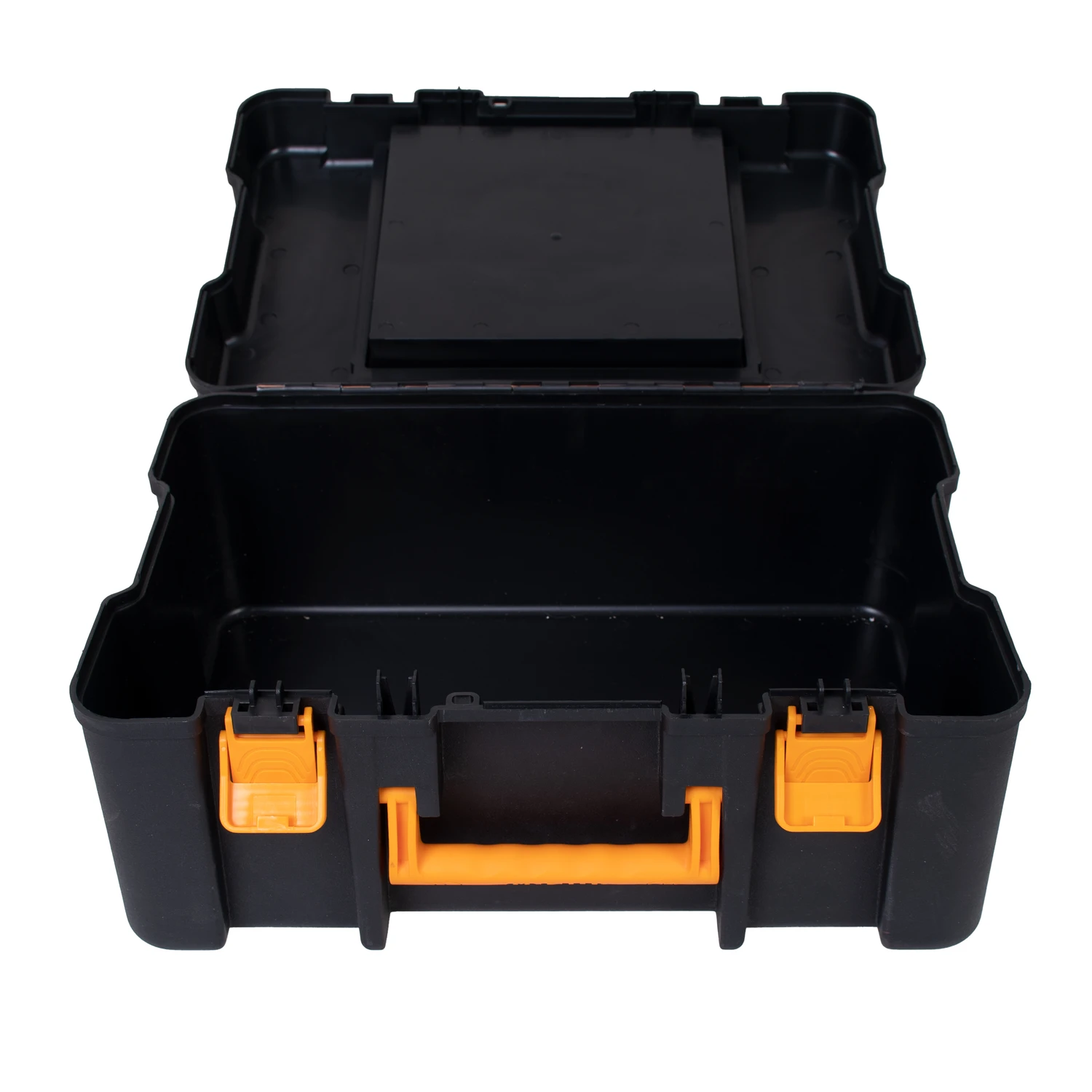 همچنین، دو قفل پلاستیکی محکم در طرفین این جعبه تعبیه شدهاند تا از باز شدن ناگهانی در هنگام جابجایی جلوگیری کنند. این قفلها حتی هنگام حمل ابزارهای سنگین نیز امنیت محتویات داخل جعبه را تضمین میکنند.