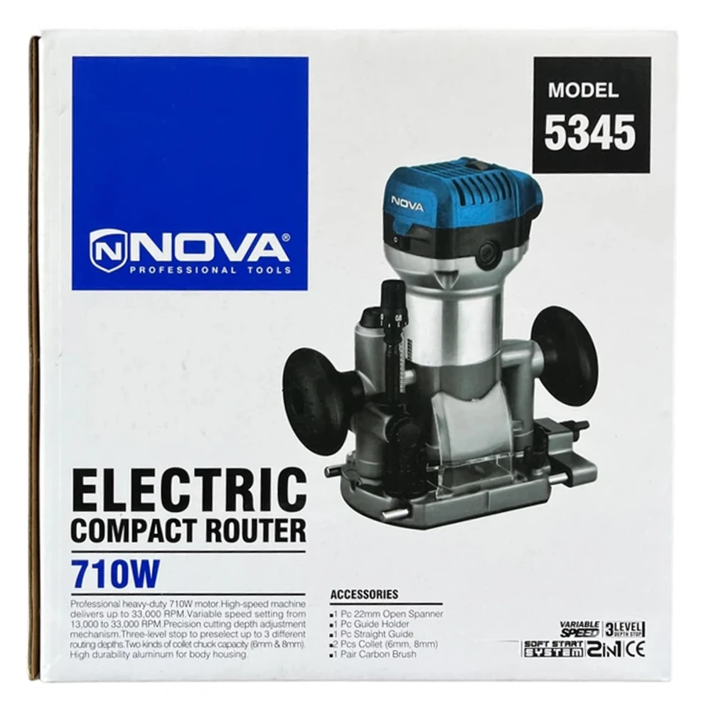بدنه اور فرز نجاری ۷۱۰ وات نووا مدل ۵۳۴۵ از آلومینیوم دایکاست ساخته شده است. این ساختار مقاومت بالایی در برابر فشار و ضربه دارد. پایه آلومینیومی دستگاه، ثبات و دقت کار را افزایش میدهد. سیستم شروع نرم، ایمنی کاربر را هنگام روشن شدن تضمین میکند. کلید برق بزرگ در برابر نفوذ گرد و غبار مقاوم است. قفل شفت، تعویض تیغه را سریع و بدون دردسر میکند. سیستم قفل کفی، مانع حرکت ناخواسته دستگاه میشود.