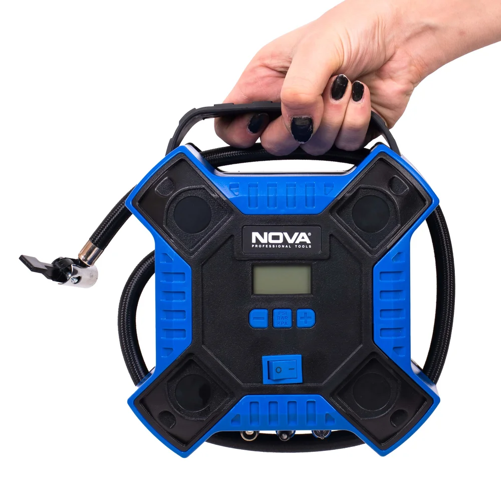 کمپرسور نووا به دو موتور فلزی مقاوم مجهز است که توان تولید فشار واقعی تا ۱۶۰ PSI (معادل ۱۱ بار) را دارند. این قدرت برای باد کردن لاستیک خودرو، موتور، دوچرخه یا وسایل بادی کاملاً کافی است. پمپ و موتور با بهرهوری بالا طراحی شدهاند تا در هر دقیقه تا ۹ لیتر هوا منتقل کنند. بدنه از پلاستیک فشرده و بادوام ساخته شده و وزن کم آن جابهجایی را آسانتر کرده است. در عین حال، ساختار فلزی داخلی سبب افزایش دوام و طول عمر دستگاه میشود.