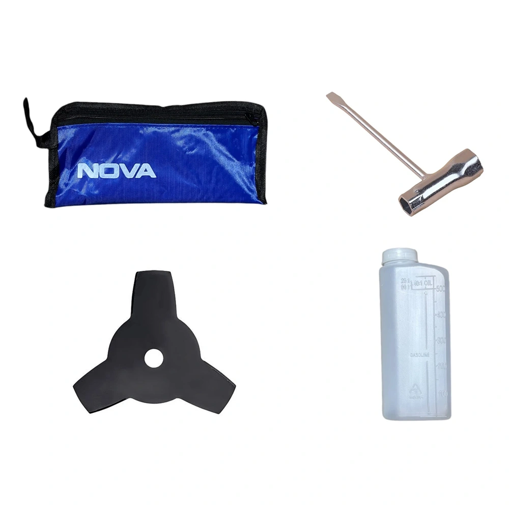 نووا برای کامل کردن تجربه استفاده، مجموعهی کاملی از لوازم جانبی را ارائه میدهد. تیغه فلزی سهپر، تیغه نایلونی تنظیمشونده، گارد محافظ، بطری روغن و بنزین، آچارها، کیف و کوله پشتی با محفظه زیپدار بخشی از این بسته هستند. همچنین شفت آلومینیومی مقاوم، کار در مسافتهای طولانی را سادهتر میکند.