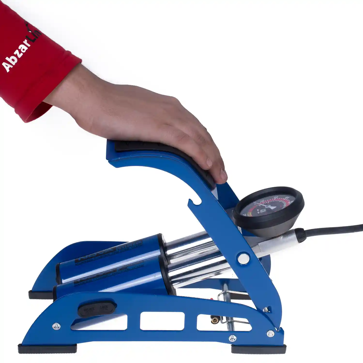 گیج بزرگ درجه بندی شده با دو مقیاس PSI و BAR / دارای پدال ضد لغزش و ایمن / دارای سیستم قفل پدال به منظور ایمنی بیشتر / استفاده از پیستون به جای میله برای افزایش قدرت و کارایی دستگاه / دارای شلنگ هوای با دوام و قابل انعطاف |
