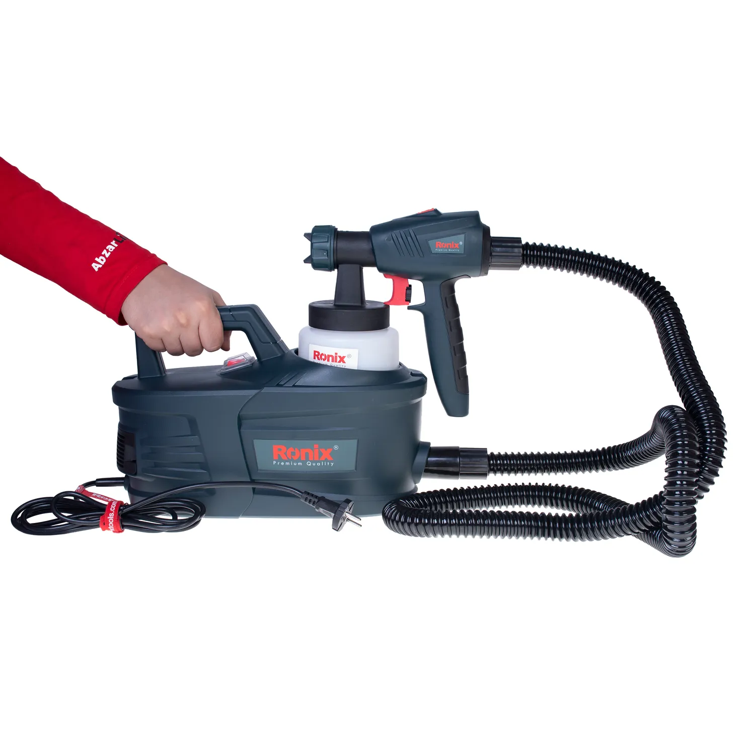 پیستوله برقی ۹۵۰ وات خرطومی رونیکس مدل ۱۳۹۵ از یک دستگاه اسپری و یک کمپرسور هوا تشکیل شده است. این دو وسیله با کمک یک شلنگ خرطومی ۱.۸ متری انعطافپذیر بهم متصل میشوند که هوا از طریق این شلنگ از کمپرسور به اسپری منتقل میشود.
