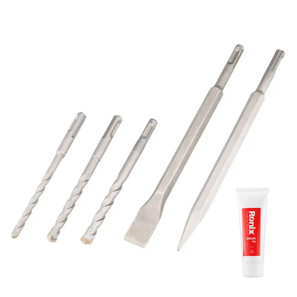 - ارائه شده به همراه میله تنظیم عمق، دسته جانبی، تیوب گریس، متههای SDS plus در اندازههای مختلف و قلم نوک پهن، قلم نوک تیز و دستمال تمیزکاری