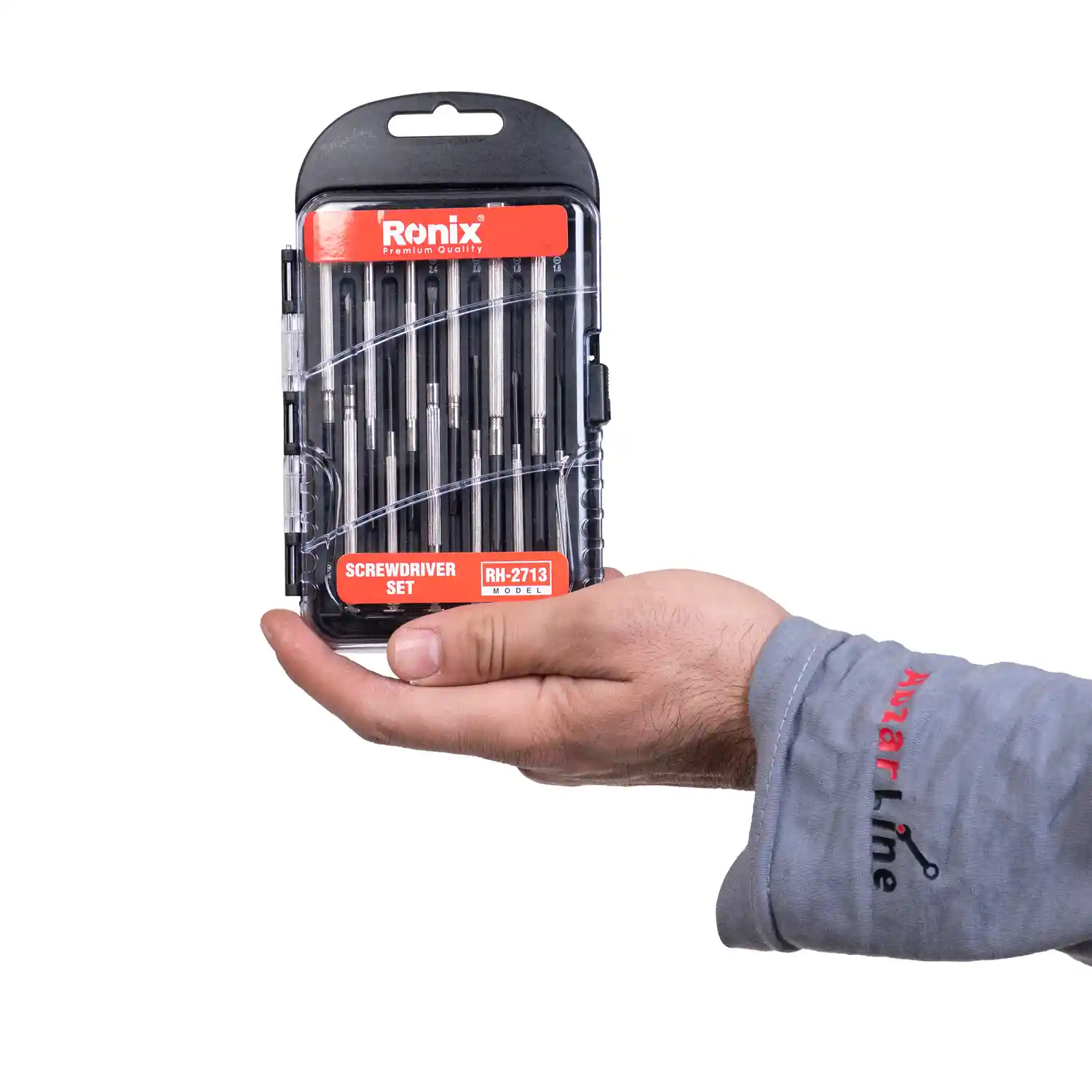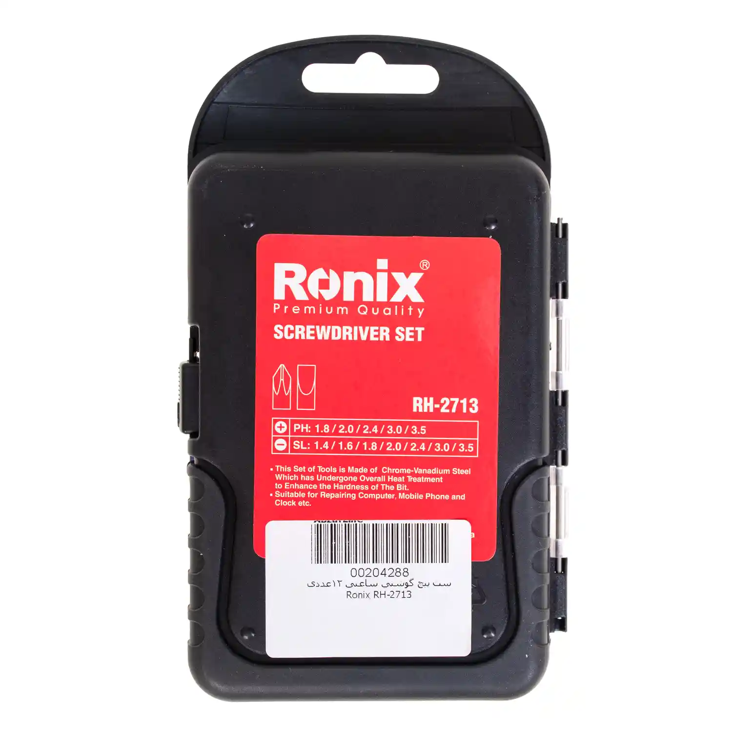 ست پیچ گوشتی ساعتی ۱۲ عددی ronix rh-2713 ، دارای ۵ عدد پیچ گوشتی چهارسو به سایزهای ۱.۸ ، ۲ ، ۲.۴ ، ۳ و ۳.۵ میلیمتر و ۷ عدد پیچ گوشتی دوسو به سایزهای ۱.۴ ، ۱.۶ ، ۱.۸ ، ۲ ، ۲.۴ ، ۳ و ۳.۵ میلیمتر میباشد.