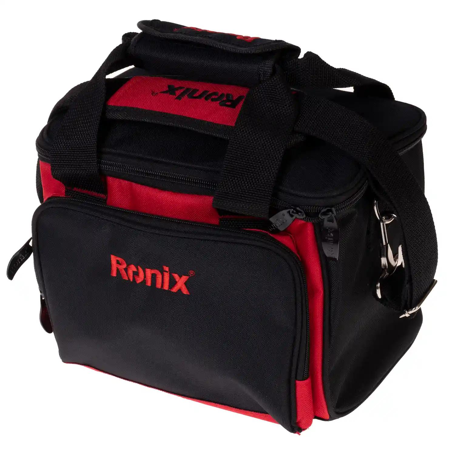 کمپرسورهوای رونیکس با سایز ۲۳×۱۴×۲۰ سانتیمتر و وزن ۱۵۲۶ گرم، بدنهای مقاوم و مستحکم با طراحی ارگونومیک دارد و دارای یک عدد کیف برزنتی قرمز و مشکی مقاوم و جادار با ابعاد ۲۰×۲۰×۲۶ و وزن ۶۱۶ گرم میباشد که حمل آن را راحت میسازد.