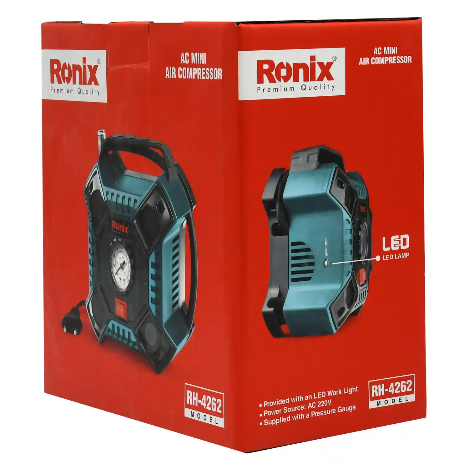 مینی کمپرسور برقی رونیکس مدل rh-4262 یک کمپرسور پر کاربرد قابل حمل، با حجم و وزن مناسب و ابعاد کوچک است که  به برق شهری متصل میشود.