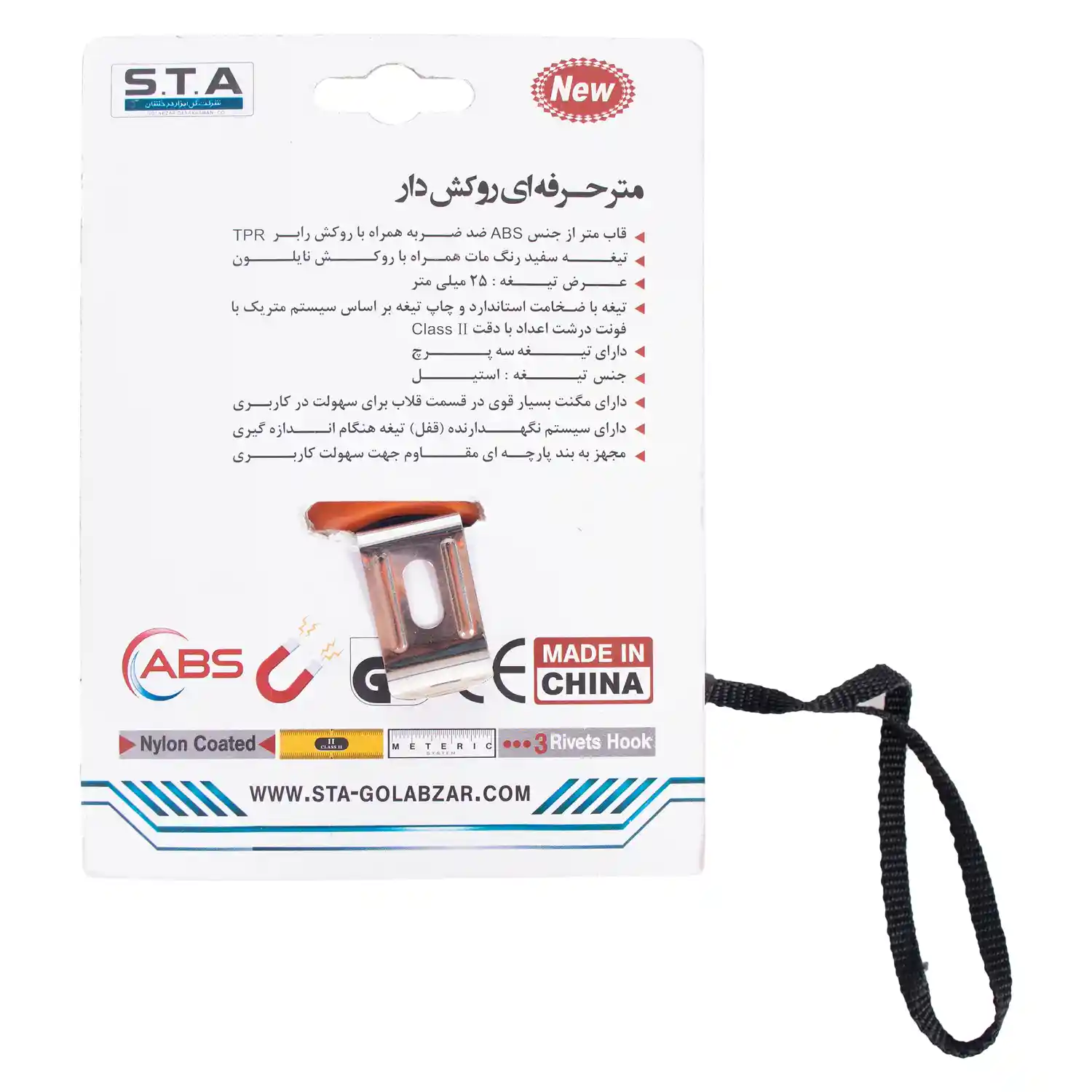 متر دستی روکش دار حرفه ای STA یک متر نواری مرغوب و بادوام همراه با قاب ABS ضد ضربه است که با رابر TPR روکش شده و مجهز به تیغه سفید رنگ ماتی است که جهت افزایش دوام ، با روکش نایلون به طور کامل پوشانده شده است.