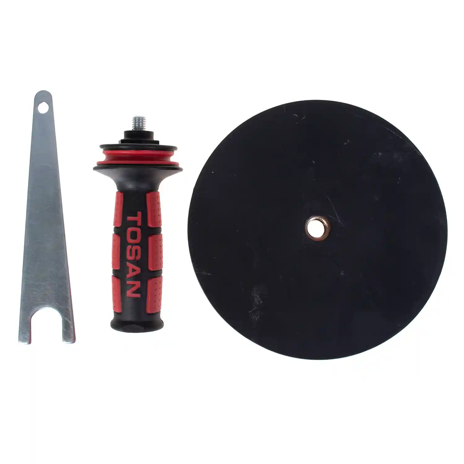 صفحه لاستیکی ضخیم، یک آچار مخصوص صفحه، یک نمد پشمی، دستهی جانبی و یک صفحهی مخصوص |