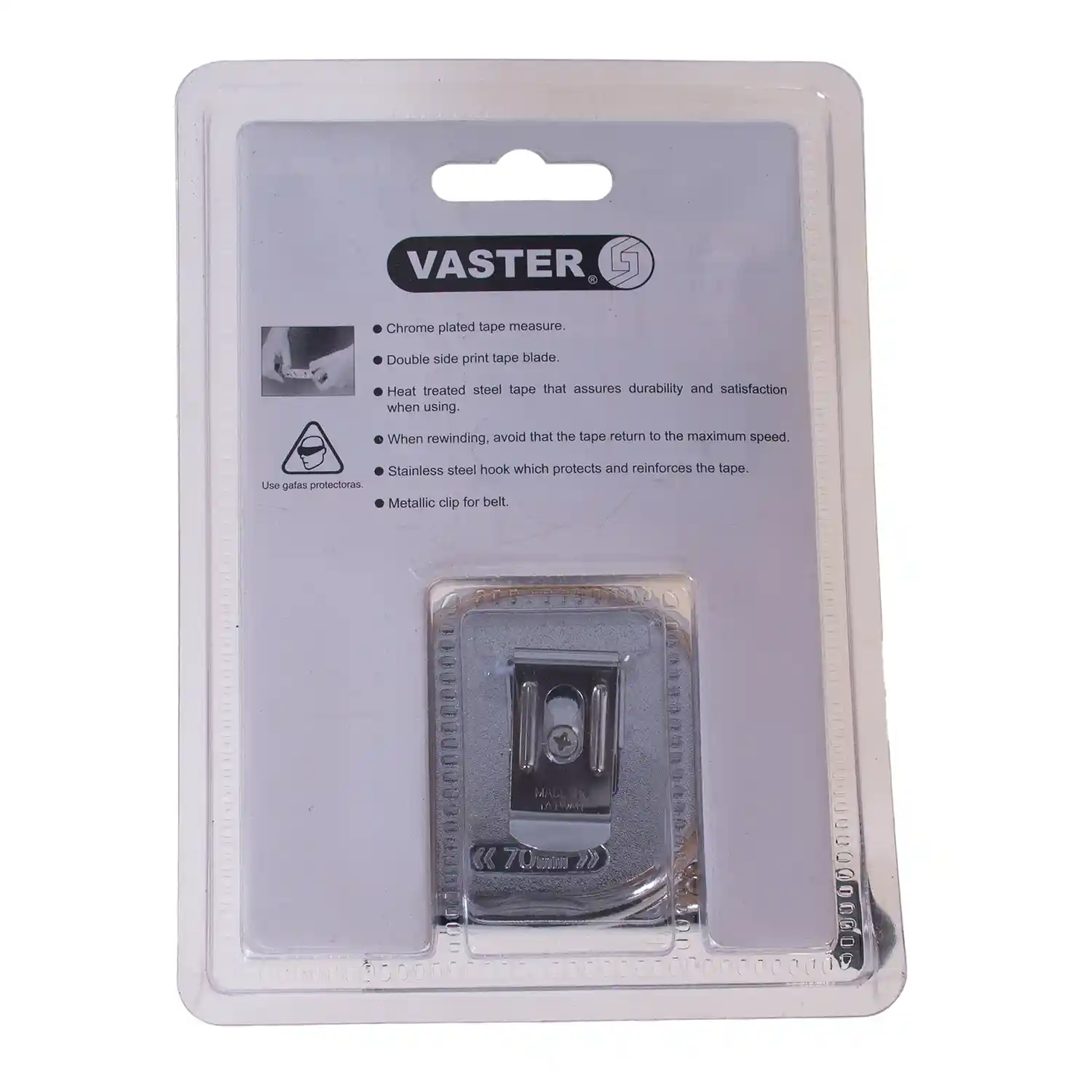 متر ۵ متری واستر دارای بدنه فلزی و مجهز به یک نوار بادوام و دقیق روکش شده با کروم است. این نوار به صورت دو رو چاپ شده که بر حسب میلیمتر، سانتیمتر، متر، اینچ و فوت درجه بندی شده است. این تیغه که از استیل گرما داده شده بادوام ساخته شده است، طولی برابر با ۵ متر و عرضی برابر با ۲۵ میلی متر دارد.
