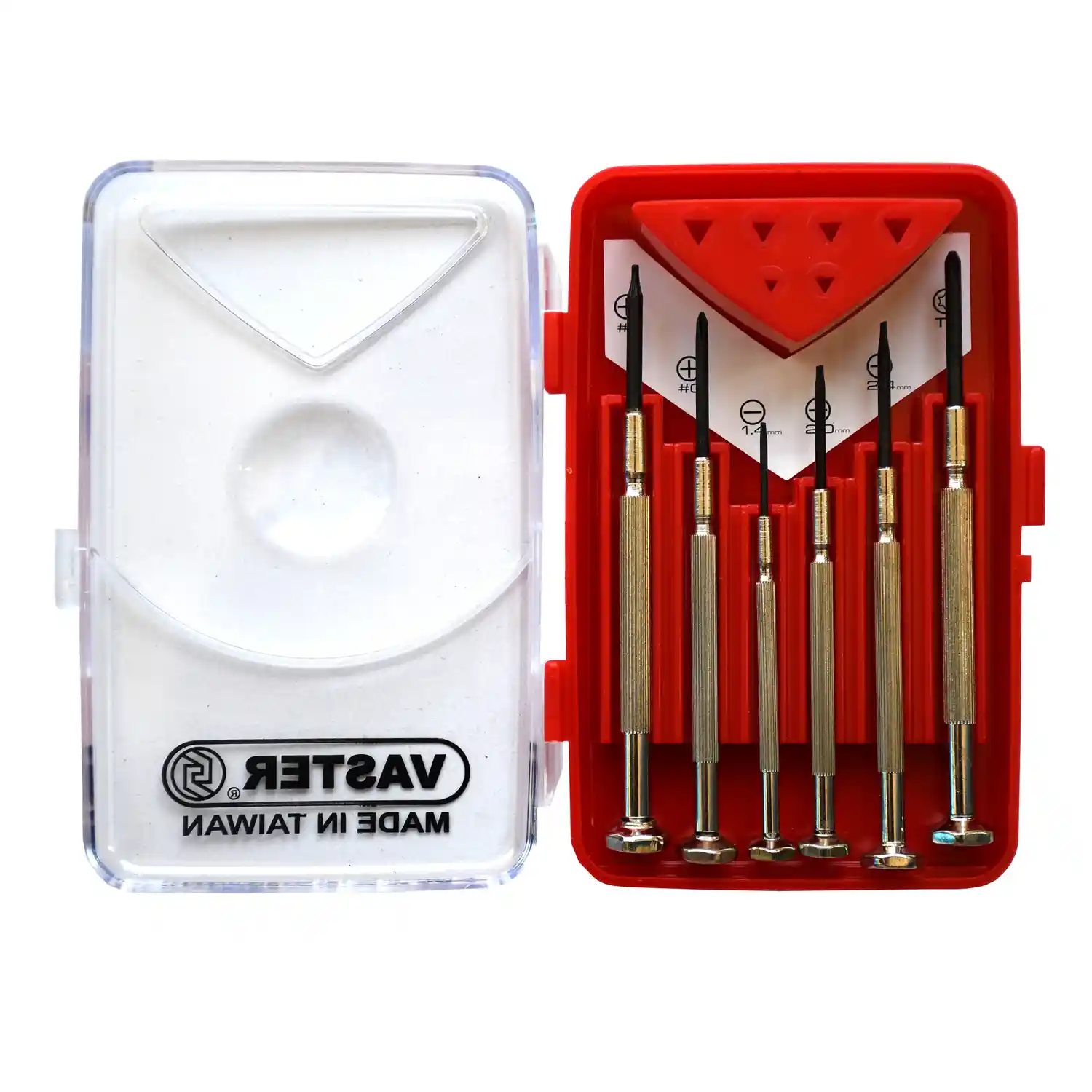 مجموعه ۶ عددی پیچ گوشتی ساعتی واستر، دارای ۶ پیچ گوشتی سایز کوچک است که علاوه بر پیچ گوشتی های دوسو و چهارسو، بر خلاف معمول، شامل یک پیچ گوشتی ستاره ای با سایز T5 نیز می باشد.